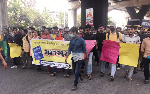 চট্টগ্রামে গণপরিবহনে হাফ ভাড়ার দাবিতে নগরে সমাবেশ ও বিক্ষোভ মিছিল করেছে সাধারণ শিক্ষার্থীরা।