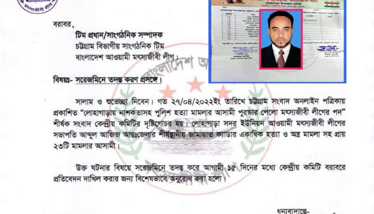 নিজস্ব প্রতিনিধি: জনপ্রিয় দৈনিক চট্টগ্রাম সংবাদ পত্রিকার অনলাইন ভার্সনে গত ২৭ এপ্রিল ‘লোহাগাড়ায় নাশকতাসহ পুলিশ হত্যা মামলার আসামি পুরষ্কার পেলো মৎস্যজীবি আওয়ামী লীগের পদ’ শীর্ষক সংবাদ প্রকাশিত হওয়ায় চট্টগ্রাম লোহাগাড়া সদর ইউনিয়নের আওয়ামী মৎস্যজীবি লীগের সভাপতি আব্দুল আজিজ এর পদ পাওয়া বিষয়ে সরেজমিন তদন্ত করার জন্য বাংলাদেশ আওয়ামী মৎস্য জীবি লীগের চট্টগ্রাম বিভাগীয় সাংগঠনিক সম্পাদক এর টিম প্রধান ও সাংগঠনিক সম্পাদকদের নির্দেশ দিলেন কেন্দ্রীয় কমিঠির সাধারণ সম্পাদক লায়ন শেখ আজগর নষ্কর। গণমাধ্যমে পাঠানো এক প্রেস বিজ্ঞপ্তির মাধ্যমে জানা যায়, সদ্য পদ প্রাপ্ত আব্দুল আজিজ আন্তঃজেলার শীর্ষ স্থানীয় একাধিক হত্যা ও অস্ত্র মামলাসহ ২৩টি মামলার আসামি। প্রেস বিজ্ঞপ্তিতে আরও জানা যায়, আগামী ১৫ দিনের মধ্যে উক্ত বিষয়ে সরেজমিন তদন্ত করে আগামী ১৫ কার্য দিবসের কেন্দ্রীয় কমিটির নিকট প্রতিবেদন দাখিল করার জন্য অনুরোধ করেছেন কেন্দ্রীয় কমিঠি।