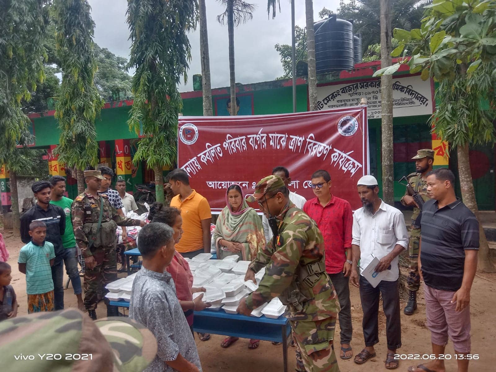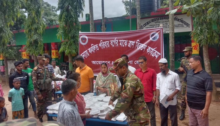 খাগড়াছড়ির দীঘিনালায় ভারী বর্ষণ ও পাহাড়ি ঢলে মাইনী নদীর তীরবর্তী এলাকাসমূহ বন্যার পানিতে প্লাবিত হয়েছে। এতে অন্তত ১ হাজার মানুষ পানিবন্দি হয়ে পড়েছেন। পানিবন্দি মানুষগুলো আশ্রয় নিয়েছেন স্থানীয় আশ্রয় কেন্দ্রে। এসব মানুষগুলোর মাঝে খাদ্যসামগ্রী তুলে দিয়েছে বাংলাদেশ সেনাবাহিনীর দীঘিনালা জোন। সোমবার (২০ জুন) দুপুর ১টায় উপজেলার বেতছড়ি, চোংড়াছড়ি ও মেরুং বাজার এলাকায় দীঘিনালা জোন অধিনায়ক মেজর নাজিম আহমেদ (পিএসসি)’র পক্ষ হতে শতাধিক পরিবারের মাঝে খাদ্যসামগ্রী তুলে দেন উপ অধিনায়ক মেজর নাজিম আহম্মেদ (পিএসসি)। উপ অধিনায়ক মেজর নাজিম আহম্মেদ জানান, দীঘিনালা উপজেলার যেকোনো প্রাকৃতিক দুর্যোগে সব ধরনের সাহায্য-সহযোগিতায় বাংলাদেশ সেনাবাহিনী দীঘিনালা জোন সবসময় পাশে ছিল, আছে এবং থাকবে। আশ্রয় কেন্দ্রে অবস্থান করা পরিবারের মাঝে দুপুরের খাবার, চাল, ডাল, তেল, লবন, খাবার স্যালাইন, বিস্কুট ও পানি দেওয়া হয়। এ সময় আরও উপস্থিত ছিলেন দীঘিনালা জোনের ওয়ারেন্ট অফিসার মো. মজিদ, ১ নং মেরুং ইউনিয়ন পরিষদের চেয়ারম্যান মাহমুদা বেগম লাকী প্রমূখ। আশ্রয়কেন্দ্র অবস্থান করা একাধিক ব্যক্তি জানান, ভারী বৃষ্টিতে পাহাড়ি ঢলে ঘরবাড়ি তলিয়ে গেছে। এ কারণে আশ্রয়কেন্দ্রে অবস্থান করছি। সেনাবাহিনীর দীঘিনালা জোন আমাদেরকে খাদ্যসামগ্রী দিয়েছে। সেনাবাহিনীর কাছ থেকে খাদ্যসামগ্রী পেয়ে ভালো লাগছে। এই সময়ে এগুলো আমাদের অনেক উপকারে লাগছে। না হয় আমাদের খুব কষ্ট পেতে হত।