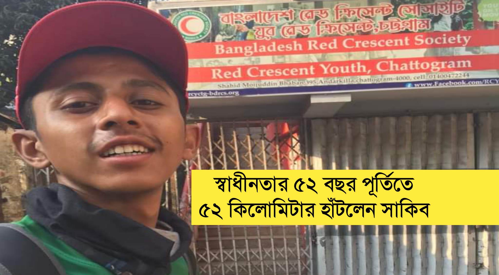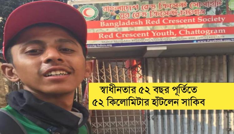 স্বাধীনতার ৫২ বছর পূর্তিতে ৫২ কিলোমিটার হাঁটলেন চট্টগ্রামের তরুণ সাইদুর রহমান সাকিব। রোববার (২৬ মার্চ) সকাল ৬টায় সাতকানিয়া থেকে যাত্রা শুরু করেন সাকিব। এরপর হেঁটে ৫২ কিলোমিটার পথ পাড়ি দিয়ে বিকাল ৪টায় চট্টগ্রাম নগরীর আন্দরকিল্লা রেড ক্রিসেন্ট অফিসের সামনে এসে পৌঁছান।