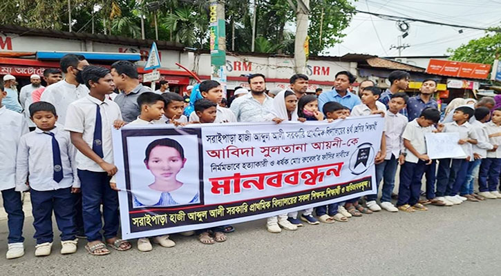 চতুর্থ শ্রেণি পড়ুয়া আবিদা সুলতানা আয়নী ওরফে আখি মনিকে ধর্ষণ ও হত্যার প্রতিবাদে মানববন্ধন করেছে নিহতের সহপাঠীরা।
