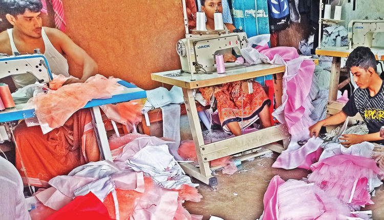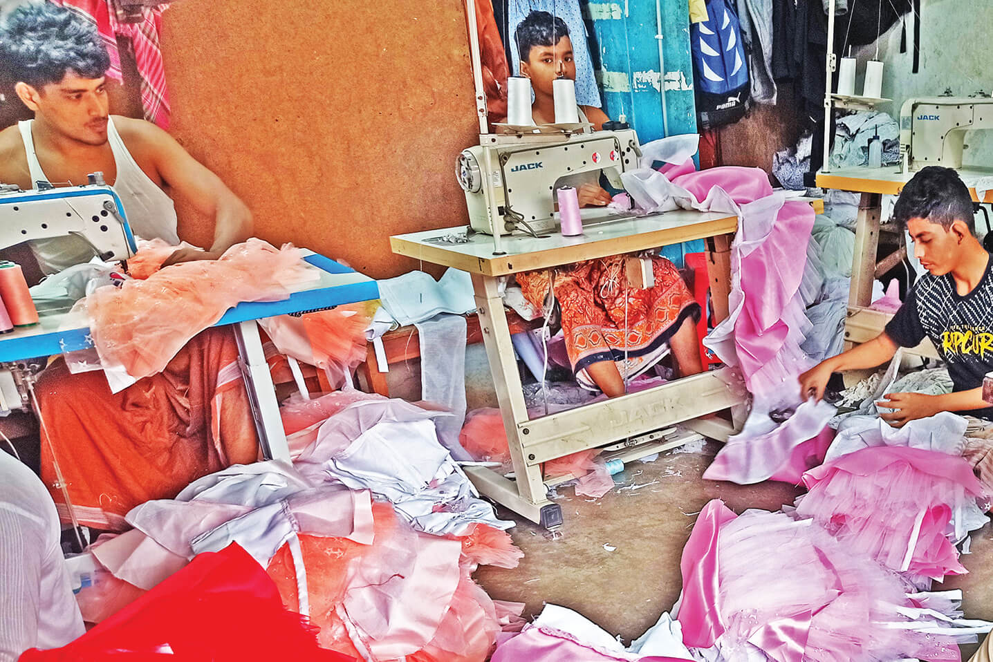 দিন-রাত মেশিনের শব্দ, হাক-ডাক। ছোট ছোট কক্ষে তিন-চারটা করে সেলাই মেশিন, আট-দশেক মানুষ। কেউ কাপড় কাটছে, কেউ সেলাই করছে, কেউ আবার ব্যস্ত কাপড় ইস্ত্রি করা নিয়ে।