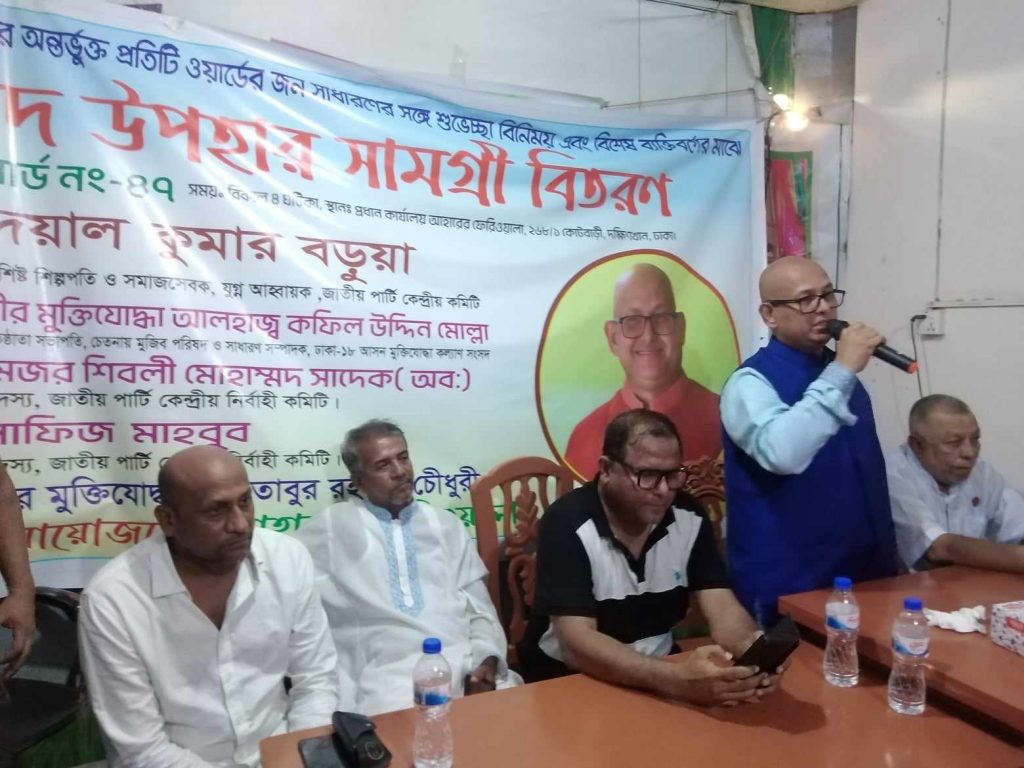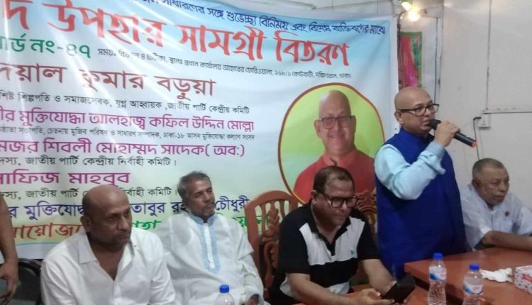 পবিত্র ঈদুল আজহা উপলক্ষে ঢাকা ১৮ আসনের ৪৭ নং ওয়ার্ডে অসহায় ও মধ্যবিত্ত পরিবারের মাজে জাতীয় পার্টির কেন্দ্রীয় নেতা দয়াল কুমার বড়ুয়া ঈদ উপহার হিসেবে খাদ্য সামগ্রী বিতরন করেন।