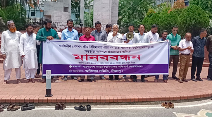স্বাগত বক্তব্যে অফিসার সমিতির সাধারণ সম্পাদক মোহাম্মদ জামাল হোসেন বলেন, দ্বাদশ জাতীয় সংসদ নির্বাচেনে বর্তমান সরকারের নির্বাচনী ইশতেহার ছিল সার্বজনীন পেনশন স্কিম চালু করা। সেই প্রতিশ্রতি পূরণের লক্ষ্যে ১৩ আগষ্ট ২০২৩ সালে ৪টি স্কিম চালুর প্রজ্ঞাপন জারি করেন। তারপর মাননীয় প্রধানমন্ত্রী ১৭ আগষ্ট ২০২৩ সালে প্রয়াস, প্রগতি, সুরক্ষা এবং সমতা নামে ৪টি সার্বজনীন পেনশন স্কিম উদ্ধোধন করেন। কিছুদিন পূর্বে অর্থাৎ ১৩ মার্চ ২০২৪ সালে অর্থমন্ত্রণলয় কর্তৃক “প্রত্যয়” স্কিমের জিও জারি করেন। এই স্কিমে স্বায়ত্বশাসিত প্রতিষ্ঠান বিশ্ববিদ্যালয়কে অন্তর্ভুক্ত করা হয়েছে। আমরা মনে করি, স্মার্ট বাংলাদেশ গড়তে প্রধানমন্ত্রীর সুন্দর পদক্ষেপকে বাধাগ্রস্থ করতে এবং বিশ্ববিদ্যালয়ের স্বাভাবিক ও সুন্দর পরিবেশকে অস্থিতিশীল করার ষড়যন্ত্র হিসাবে এই “প্রত্যয়” স্কিম চালু করেছে। মাননীয় প্রধানমন্ত্রীকে বিষয়টি খতিয়ে দেখার জন্য মানববন্ধন কর্মসূচি থেকে সবিনয়ে অনুরোধ করছি। ফলে আমাদের পারিবারিক আর্থিক সুরক্ষা নষ্ট করেছে। আমরা মনে করি, স্মার্ট বিশ্ববিদ্যালয় ও স্মার্ট বাংলাদেশ গড়ার জন্য বিশ্ববিদ্যালয় কর্মকর্তাদের ভবিষ্যত আর্থিক সুরক্ষা বলয় নিশ্চিত করতে হবে। আমাদের উপর আরোপিত এই বৈষম্যমূলক প্রজ্ঞাপনের প্রত্যাহার চাই। এই “প্রত্যয়” স্কিম বাতিল করা হউক।