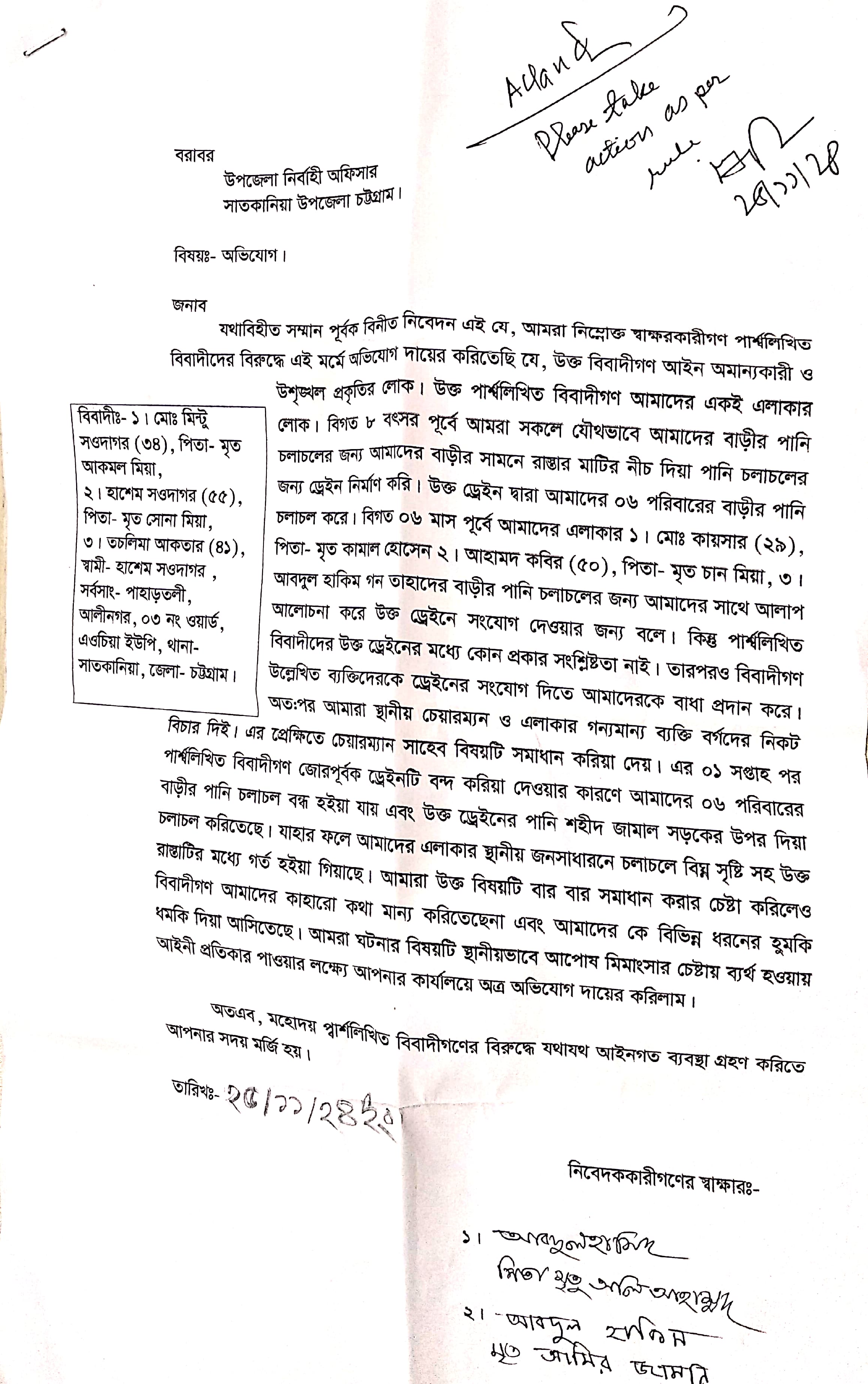 এ ঘটনায় এলাকার স্থানীয়রা আতঙ্কিত হয়ে পড়েন এবং দ্রুত ঘটনাটি স্থানীয় গন্যমান্য ব্যক্তিদের কাছে নিয়ে যান। তবে, অভিযোগকারীরা জানান যে, বিবাদীরা তাদের কোনো কথাই শোনেননি এবং হুমকি দিতে থাকেন। এর পর, আহত মহিলাসহ অন্যান্য ক্ষতিগ্রস্তরা সাতকানিয়া উপজেলা নির্বাহী অফিসারের কাছে একটি লিখিত অভিযোগ দায়ের করেন।