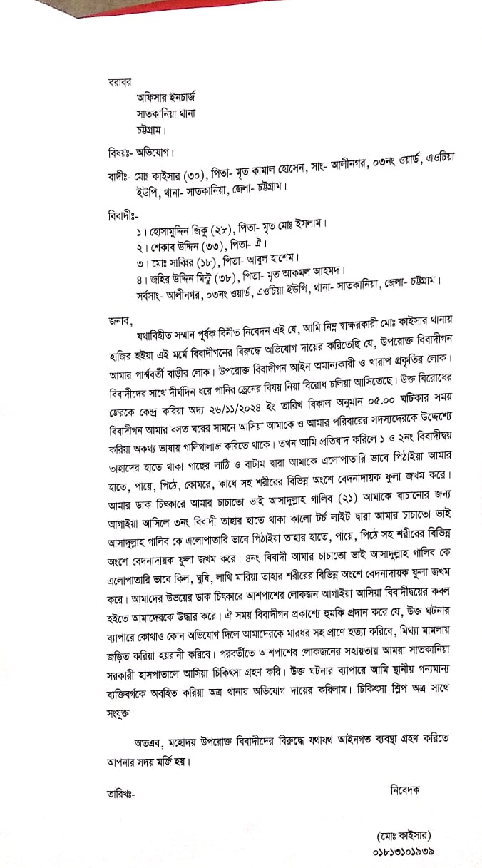 সাতকানিয়া উপজেলার এওচিয়া আলীনগর ০৩ নং ওয়ার্ডে স্থানীয় একটি ড্রেইন সিস্টেম নিয়ে বিরোধের জেরে এক নারীসহ কয়েকজন স্থানীয় বাসিন্দার ওপর দেশীয় অস্ত্র দিয়ে হামলা চালানো হয়েছে। অভিযোগ রয়েছে, কিছু ব্যক্তি ড্রেইন বন্ধ করে দেওয়ার পর এলাকার বাসিন্দারা প্রতিবাদ জানালে, একই এলাকার অভিযুক্ত তসলিমা আকতার তাদের ওপর হামলা চালান।