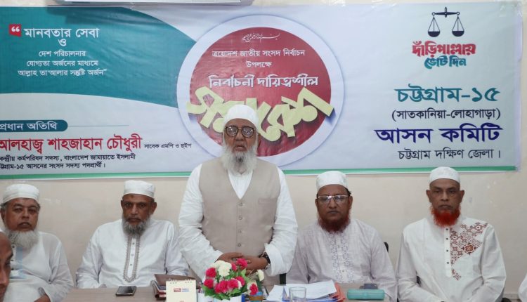 বাংলাদেশ জামায়াতে ইসলামীর কেন্দ্রীয় কর্মপরিষদ সদস্য, চট্টগ্রাম-১৫ সাতকানিয়া লোহাগাড়া সংসদীয় আসনের জামায়াতের মনোনীত প্রার্থী ও সাবেক এমপি জননেতা আলহাজ্ব শাহজাহান চৌধুরী বলেছেন, নিরাপদ ও দুর্নীতিমুক্ত সাতকানিয়া লোহাগাড়া গড়তে জনগণ আজ ঐক্যবদ্ধ হয়েছে। জনগণ নতুন করে কোন ফ্যাসিবাদ কায়েম করতে দিবে না, ইনশাআল্লাহ। সকল দল ও মতের লোকদের যথাযথ সম্মান দিতে হবে। জনগণের জন্য কাজ করতে হবে। তাহলেই সাধারণ জনগণের আস্থা ও বিশ্বাস অর্জন করা সম্ভব হবে। আগামী নির্বাচনে সারাদেশে ইসলামী শক্তির বিজয় হবে, ইনশাআল্লাহ।