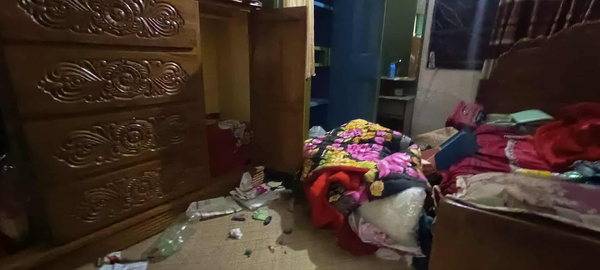 ঘরের বাসিন্দা নুর উদ্দীন বলেন, রাত তিনটার সময় আমার ভাবির ঘরের দরজা ভেঙ্গে ১০ থেক ১৫ জনের একটি ডাকাত দল ঘরে ডুকে, ঘরে ডুকার সাথে সাথে তার গলায় চুরি ধরে জিম্মি করে পেলে তাকে, তার ঘর থেকে সব নিয়ে তার পর আমার ঘরে আসে, আমার হাত পা চোঁখ বেঁধে সাড়ে তিন ভরি স্বর্ণ ও ৫২ হাজার টাকা নিয়ে যায় ডাকাত দলের সদস্যরা।