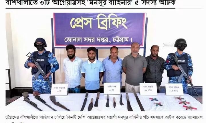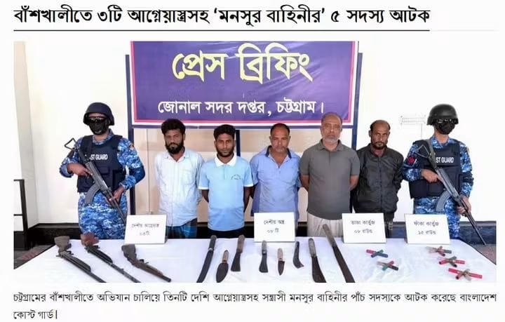 চট্টগ্রামের বাঁশখালীতে অভিযান চালিয়ে তিনটি দেশি আগ্নেয়াস্ত্রসহ সন্ত্রাসী মনসুর বাহিনীর পাঁচ সদস্যকে আটক করেছে বাংলাদেশ কোস্ট গার্ড।