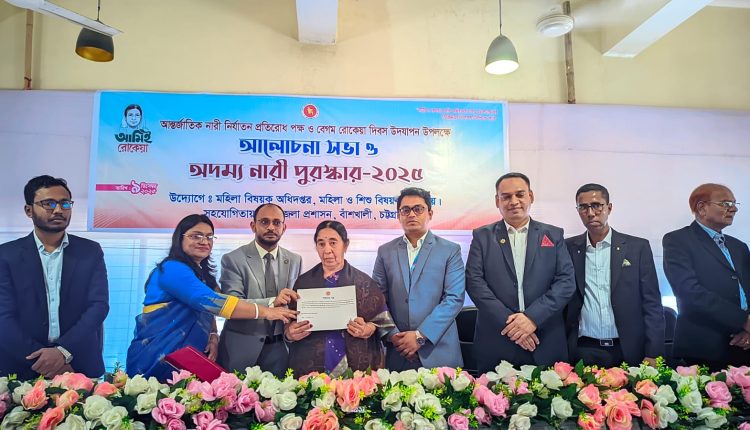বাঁশখালীতে অদম্য নারী ক্যাটাগরিতে সফল জননী হিসেবে পুরস্কার নিচ্ছেন অমিতা নন্দী “নারী ও কন্যার প্রতি সহিংসতা বন্ধে ঐক্যবদ্ধ হই, ডিজিটাল নিরাপত্তা নিশ্চিত করি” এ প্রতিপাদ্য সামনে রেখে চট্টগ্রামের বাঁশখালীতে আন্তর্জাতিক নারী নির্যাতন প্রতিরোধ পক্ষ ও বেগম রোকেয়া দিবস উদযাপন এবং অদম্য নারী সংবর্ধনা অনুষ্ঠিত হয়েছে।