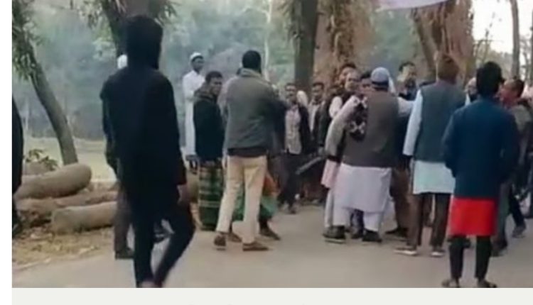 বাজারের ভেতর রাস্তা সংস্কারের জন্য ইট তুলে রেখেছে। দুই পক্ষ দুই পক্ষের দিকে সেই ইট ছুড়ে মারে।