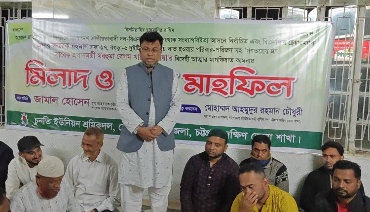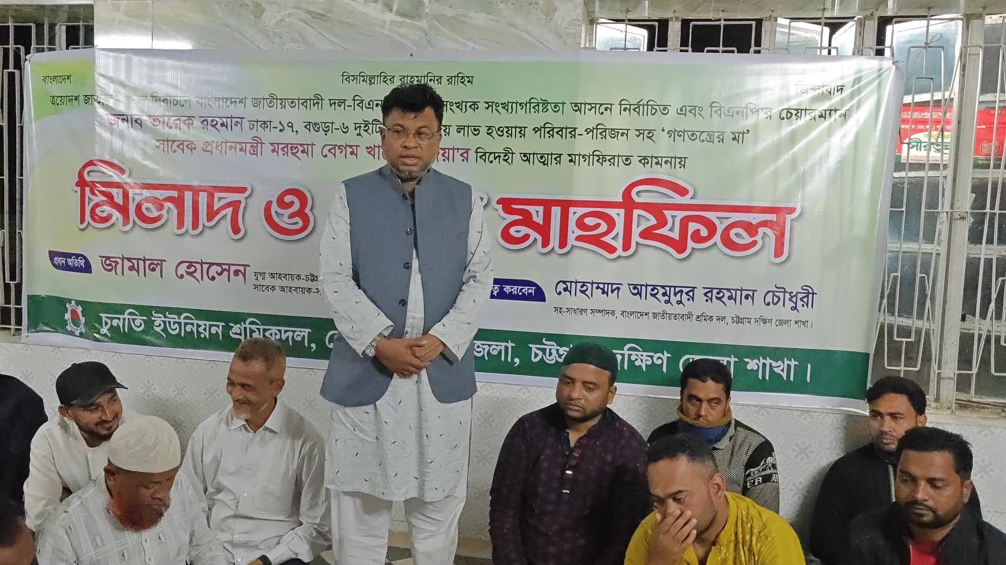 মিলাদ ও দোয়া মাহফিলে চট্টগ্রাম দক্ষিণ জেলা শ্রমিক দলের সহসাধারণ সম্পাদ মোহাম্মদ আহমুদুর রহমান চৌধুরীর সভাপতিত্বে প্রধান অতিথি হিসেবে উপস্থিত ছিলেন যুগ্ম আহবায়ক-চট্টগ্রাম দক্ষিণ জেলা বিএনপির যুগ্ন আহবায়ক ও সাতকানিয়া উপজেলা বিএনপির সাবেক আহবায়ক মো: জামাল হোসেন।